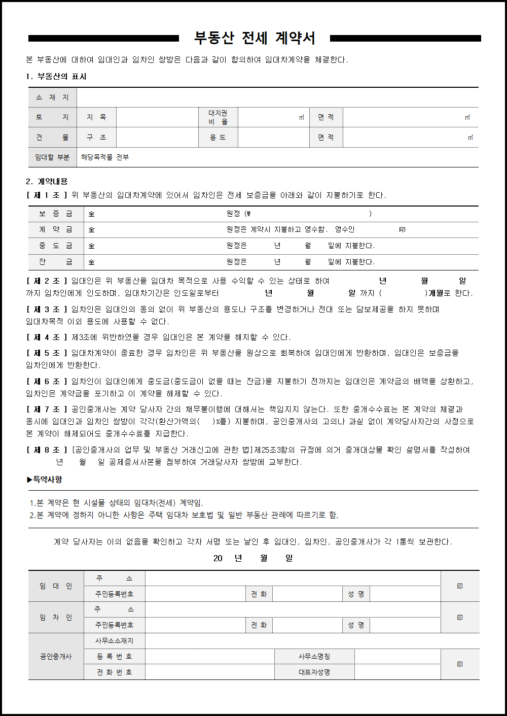 - 표준 임대차계약서 사용: 계약서는 법무부에서 제공하는 표준 임대차계약서를 사용하는 것이 바람직합니다. 이를 통해 임대인과 임차인의 권리와 의무를 명확히 할 수 있습니다.